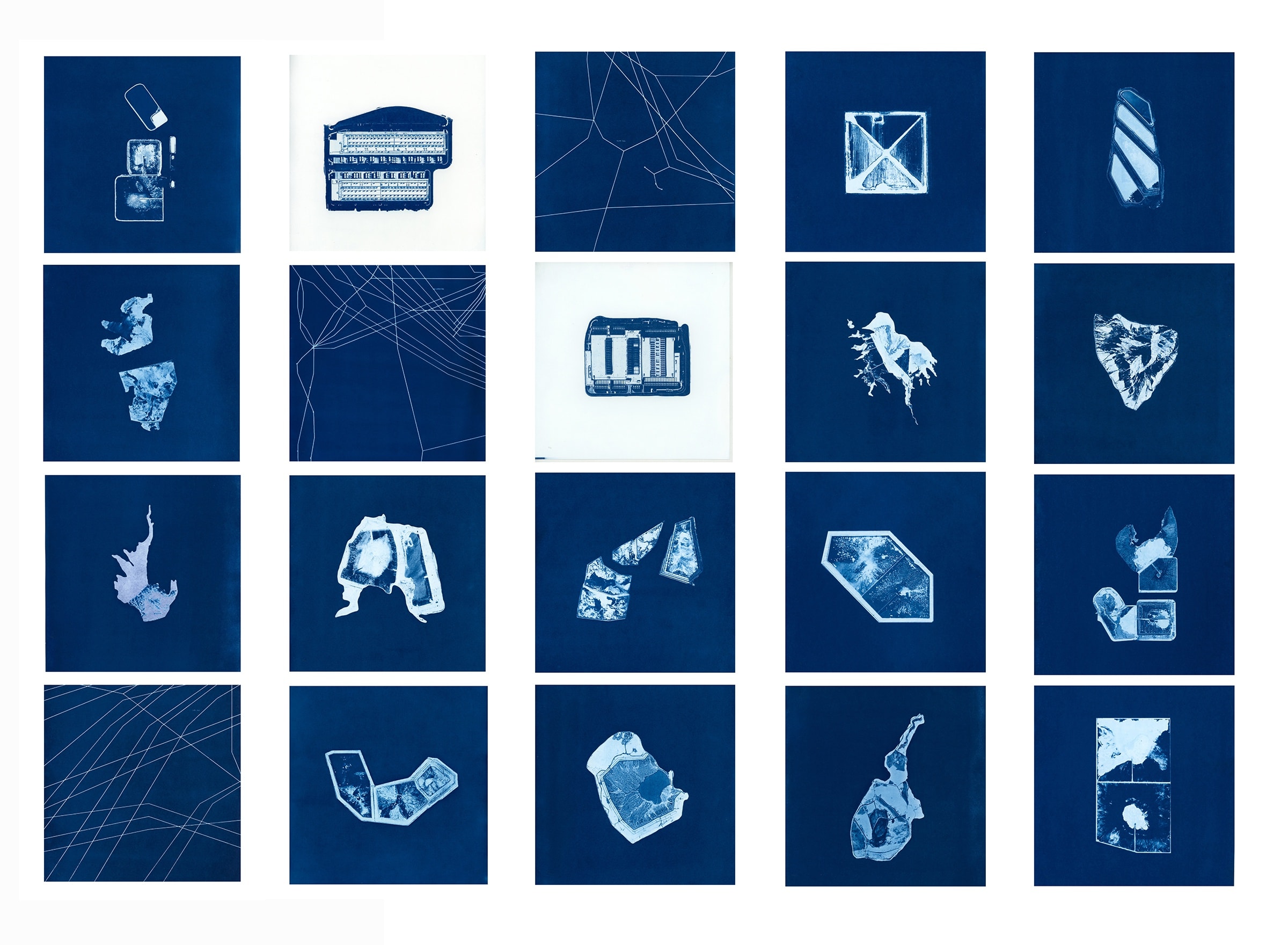 Finally, Philippe Calia explores the materiality of the archive, highlighting its precarity and extractive nature. Through Cloud Atlas, a set of cyanotypes that map the vast geographical breadth of the physical infrastructure that is essential to the production, storage and circulation of information today, Calia shows how maintaining records of our present depends upon an increasingly unsteady ravaging of rare minerals and other natural resources.