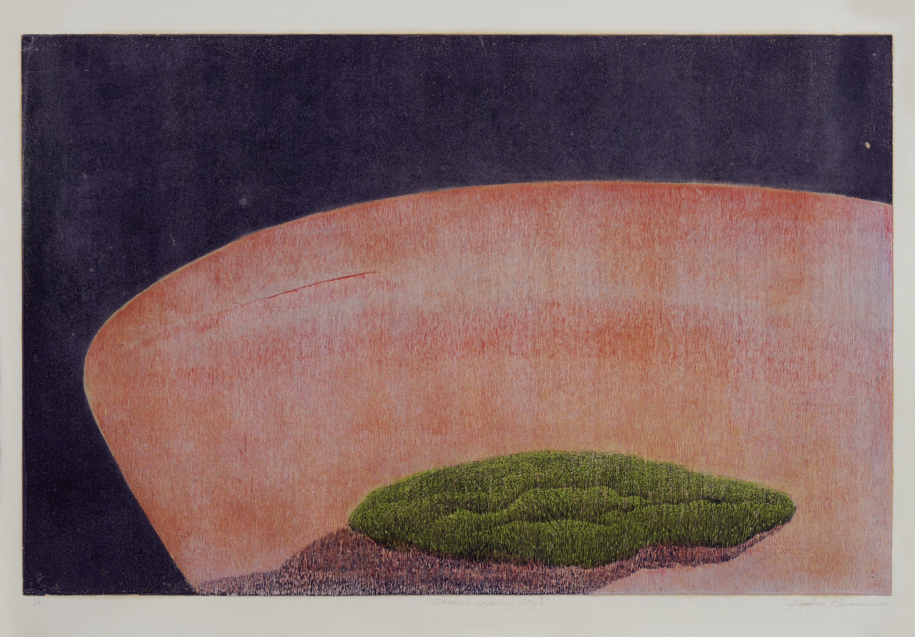 An excerpt from the catalogue essay written by Nancy Adajania, "Soghra Khurasani’s recent exhibition – ‘Shadows Under My Sky’ – marks a transition from the high colour and operatic gestures of her earlier prints to a gentler, more reflective register. The fissured earth and volcanic craters are no longer cast in harsh reds and pinks. The artist now dwells on luminous evocations of night, quiet fields, emerald islands and wetlands that nurture processes of germination. Soghra has spoken of her feeling of having been ‘labelled’ through stereotypes of gender, religion and ethnicity, and has resisted such mechanisms of Othering. In her new work, she establishes a solidarity with those who nourish an earth that has for too long been exploited for its mineral and vegetable fecundity. Having herself become involved in small-scale cultivation around her studio on the outskirts of Baroda, she finds a natural affinity with the farmers whose protests have spearheaded a resistance to the Indian State’s attempt to privatise agriculture and concentrate it in the hands of a corporate oligarchy. Soghra’s previous disquiet at being Othered and her more recent preoccupation with the diversity of India’s environment come together in works where she depicts marsh grass, emblematic of the wetlands that are not recognized by the Forest Act, which is more closely linked to revenue classification than to ecological sensitivity. These seemingly marginal zones are, in fact, essential to the health of the ecosystem. The marsh grass becomes symbolic, in Soghra’s lexicon, for the ‘unwanted’ that, in fact, holds the promise of regeneration. We are mesmerized by this woodcut, which, along with the quintessential high horizon line of Soghra’s works, projects both resilience and serenity. "